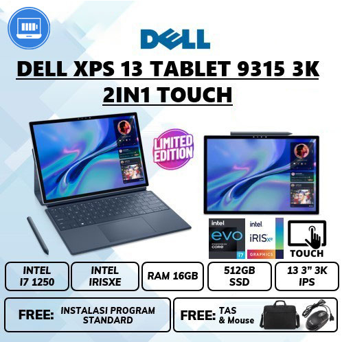 Detail Laptop Dell xps 13 tablet 9315 3k intel i7 1250 ram 16gb ssd 512gb 13"