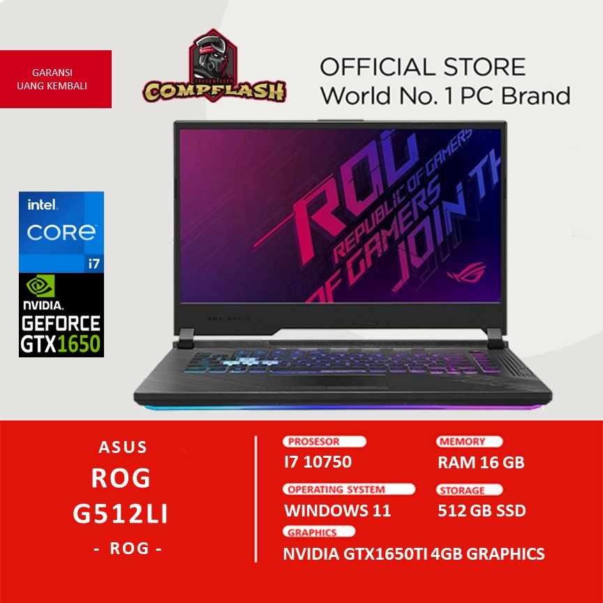 ASUS ROG G512LI i7 10750 16GB 512SSD GTX1650TI 4GB W10 15.6FHD 144HZ VARIAN +ANTI GORES (unit laptop sudah include dengan screen protector , laminasi body atas + clean kit) Spesifikasi Processor : Intel® Core™ i7-10750H Processor (12M Cache, up to 5.00 GHz) Memory : 16GB DDR4 SO-DIMM Storage : 512GB SSD M.2 PCIe Graphics : NVIDIA® GeForce® GTX 1650Ti GDDR6, with 4GB VRAM Operating system : Windows 10 Home Display : 15.6" (16:9) LED-backlit FHD (1920x1080) 67% SRGB, 3Ms\
