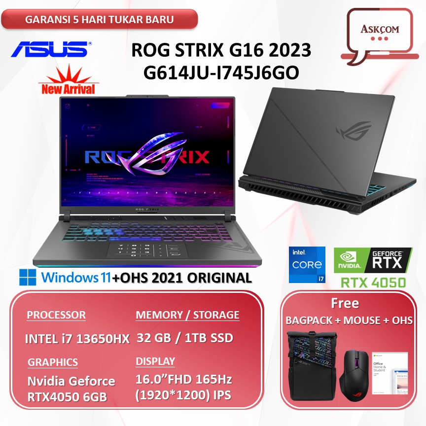 ROG Strix G16 (2023) G614J ASUS ROG STRIX G614JU I745J6GO RTX4050 6G/ I7 13650HX 32GB 1TBSSD W11+OHS 16.0FHD 165HZ 4ZRGB MOS 2YR+1YR PERFECT GRY ================================ Spesfikasi: -Processor : Intel Core i7-13650HX Cache 24 M, hingga 4,90 GHz 14Core -Memory : 32GB / 16GB DDR5-4800 SO-DIMM -Storage : 1TB / 512GB PCIe 4.0 NVMe M.2 SSD -Graphics : NVIDIA GeForce RTX4050 Laptop GPU 6GB GDDR6 (2370MHz Boost Clock+50MHz OC, 115W+25W Dynamic Boost) -Operating system : Windows 11 Home and Student 2021 included -Display : 16.0 FHD+ 16:10 (1920 x 1200, WUXGA) IPS sRGB:100% Refresh Rate:165Hz G-Sync, MUX Switch + NVIDIA® Advanced Optimus -Audio : Smart Amp Technology Dolby Atmos, Hi-Res certification -Keyboard : Backlit Chiclet Keyboard 4-Zone RGB Touchpad -Camera : 720P HD camera -Network and Communication : Wi-Fi 6E(802.11ax) (Triple band) 2*2 + Bluetooth® 5.2