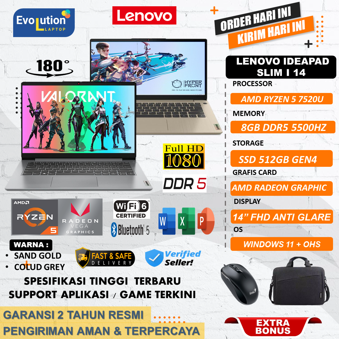 SPESIFICATION RYZEN 5 Processor : AMD Ryzen 5 7520U (4C / 8T, 2.8 / 4.3GHz, 2MB L2 / 4MB L3) RAM : 8GB Soldered LPDDR5-5500MHZ Storage : 512GB SSD M.2 2242 PCIe GEN 4.0x4 NVMe Graphics : Integrated AMD Radeon 610M Graphics Display : 14" FHD (1920x1080) TN 220nits Anti-glare Sistem Operasi : Windows 11 Home 64bit + Microsoft Office Home & Student 2021