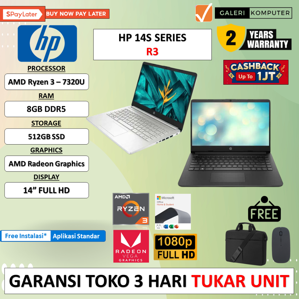 Detail LAPTOP GAMING MURAH HP 14S AMD RYZEN 3 7320U 16GB DDR5 512GB 14" FHD WINDOWS 11 HOME FREE OFFICE HOME & STUDENT
