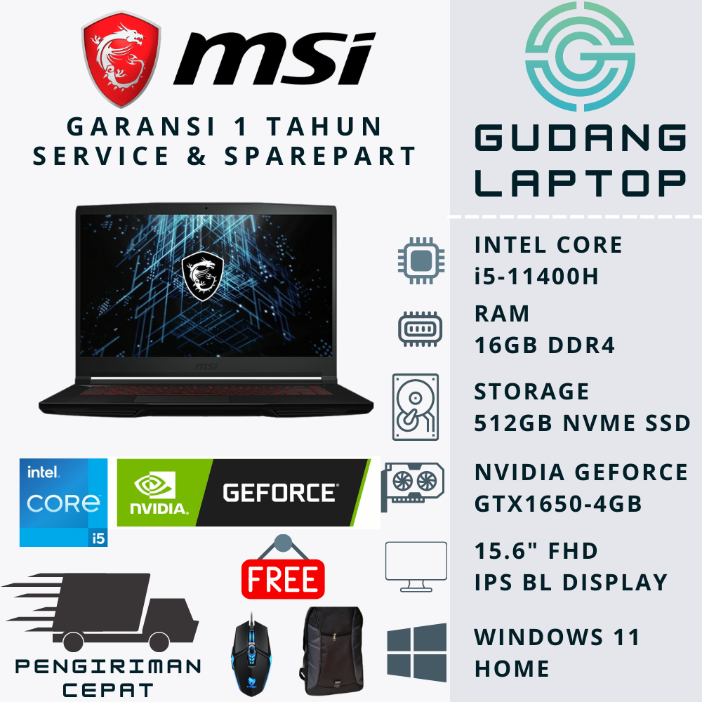 ✅ SPESIFIKASI UTAMA ( MSI GF63 Thin 11UC - RTX 3050 ) ⭕ Processor : Intel Core i5-11400H 2.7 - 4.5GHz ( 6 Cores / 12 Threads. 12MB Cache ) ⭕ Ram : 8GB(8X1) / 16GB ( 8GBx2 ) DDR4 3200MHz ⭕ Storage : 512GB SSD M.2 PCIe® NVMe® / 1TB SSD ( 512GB + 512GB SATA SSD ) ⭕ Display : 15.6" FHD (1920x1080), 144Hz, IPS-Level ⭕ Graphics Card : NVIDIA® GeForce RTX™ 3050 Laptop GPU, 4GB GDDR6 Up to 1172.5MHz Boost Clock 40W Maximum Graphics Power with Dynamic Boost. ⭕ OS : Windows 11 Home 64 Bit