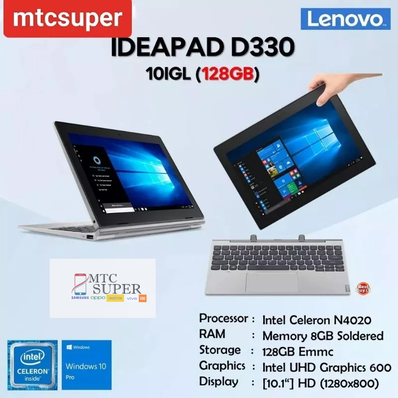 Spesifikasi Laptop Lenovo : - Prosessor Intel® N4020 - Memory 8 GB DDR4L onboard - Storage 128 GB EMMC - Grafis Intel® Integrated Graphics - Layar 10.1”, FHD (1920 x 1080) IPS, touchscreen 2in1 Detail OS : Windows 10 PRO - Audio Dolby Premium Audio - Networking 802.11ac 1x1 Wireless Bluetooth4.0 - Interface USB-C 3.1 2x USB 2.0 (on dock) Micro SD (optional) Combo Audio - Baterai Up to 13 hours, based on MobileMark® 2014 tests - Dimensi Produk Tablet: 249 mm x 178 mm x 9.5 mm / 9.8"" x 7.0"" x 0.4"" Docking: 249 mm x 186 mm x 8.5mm / 9.8"" x 7.3"" x 0.3 - Berat Tablet: Starting from 594 g / 1.3 lb Docking: Starting from 512 g / 1.1 lb