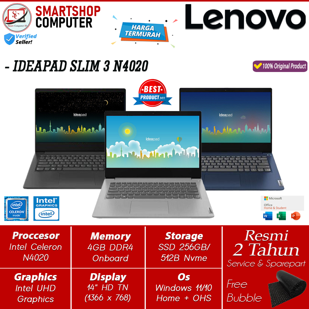 ❗ SPESIFIKASI Processor Intel Celeron N4020 (2C / 2T, 1.1 / 2.8GHz, 4MB) Graphics Integrated Intel UHD Graphics 600 Chipset Intel SoC Platform Memory 4GB Soldered DDR4-2400 Memory Slots Memory soldered to systemboard, no slots Max Memory 4GB soldered memory, not upgradable Storage 256GB SSD M.2 2242 PCIe 3.0x2 NVMe Card Reader 4-in-1 Card Reader Optical None Audio Chip High Definition (HD) Audio Speakers Stereo speakers, 1.5W x2, Dolby Audio Camera 720p with Privacy Shutter Microphone 2x, Array Battery Integrated 35Wh Max Battery Life MobileMark 2014: 14 hr Power Adapter 45W Round Tip Wall-mount DESIGN Display 14" HD Touchscreen None Keyboard Non-backlit, English Case Color Business Black / Abbys Blue Surface Treatment Texture Case Material PC + ABS (Top), PC + ABS (Bottom) Dimensions (WxDxH) 327.1 x 241 x 19.9 mm (12.88 x 9.49 x 0.78 inches) Weight 1.5 kg (3.3 lbs) SOFTWARE Operating System Win 11 Home 64, English Bundled Software Office Home and Student 2021