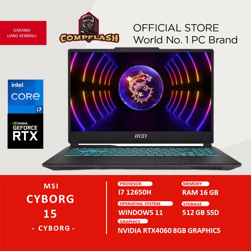 SPESIFIKASI • Processor: Intel® Core™ i7-12650H Processor 24M Cache, up to 4.70 GHz • RAM: 16GB /32GB (8GB*2) DDR5 4800Mhz, MAX 64GB • Storage: 512GB NVMe PCIe SSD Gen4x4 w/o DRAM • Graphics: NVIDIA® GeForce RTX™ 4060 Laptop GPU 8GB GDDR6, Up to 1470MHz Boost Clock 45W Maximum Graphics Power with Dynamic Boost. *May vary by scenario • Display: 15.6″ FHD (1920*1080), 144Hz 45%NTSC IPS-Level • OS: Windows 11