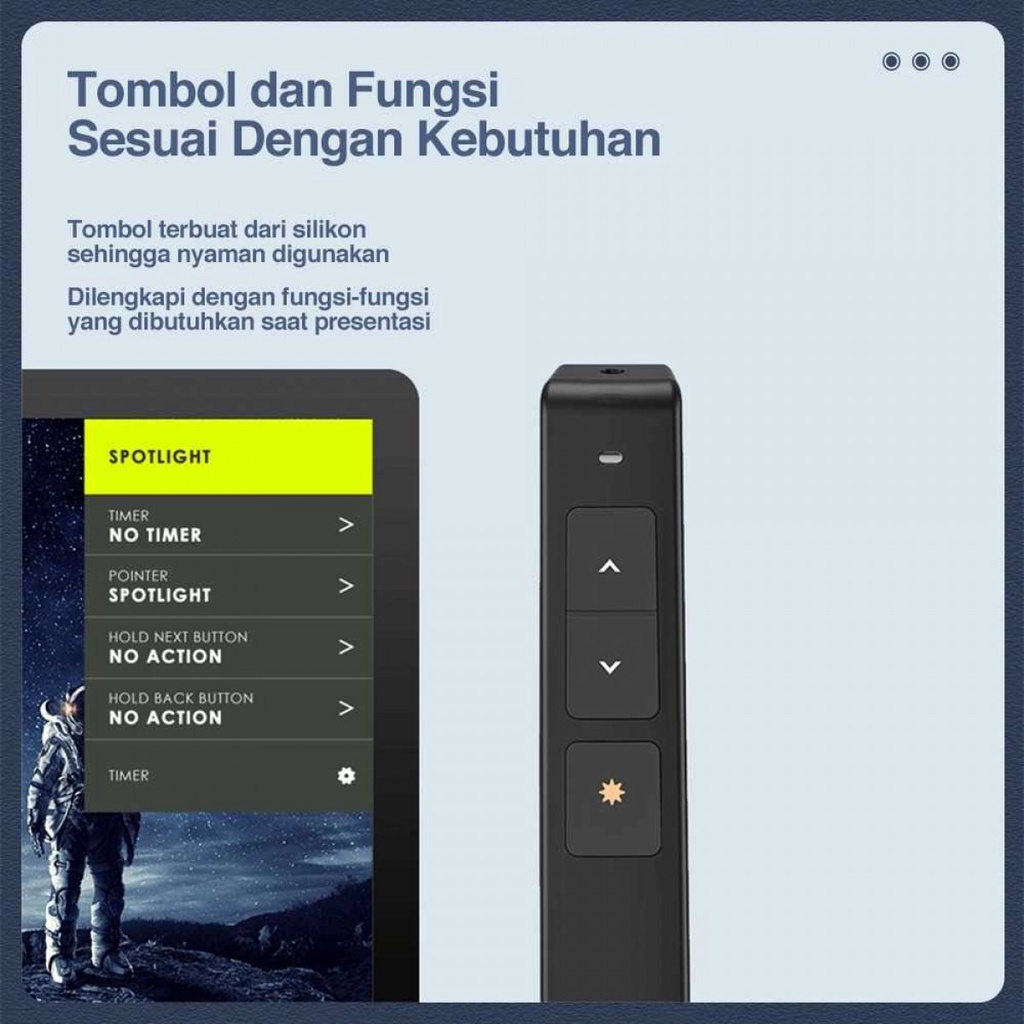 Tak Perlu Berdiam Diri di Depan Laptop Pointer dilengkapi dengan beragam tombol untuk memudahkan Anda mengganti slide hingga jarak 30 meter jauhnya. Anda pun tak perlu berjalan kembali menuju laptop hanya untuk mengganti slideshow.