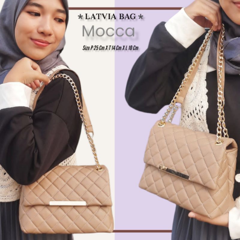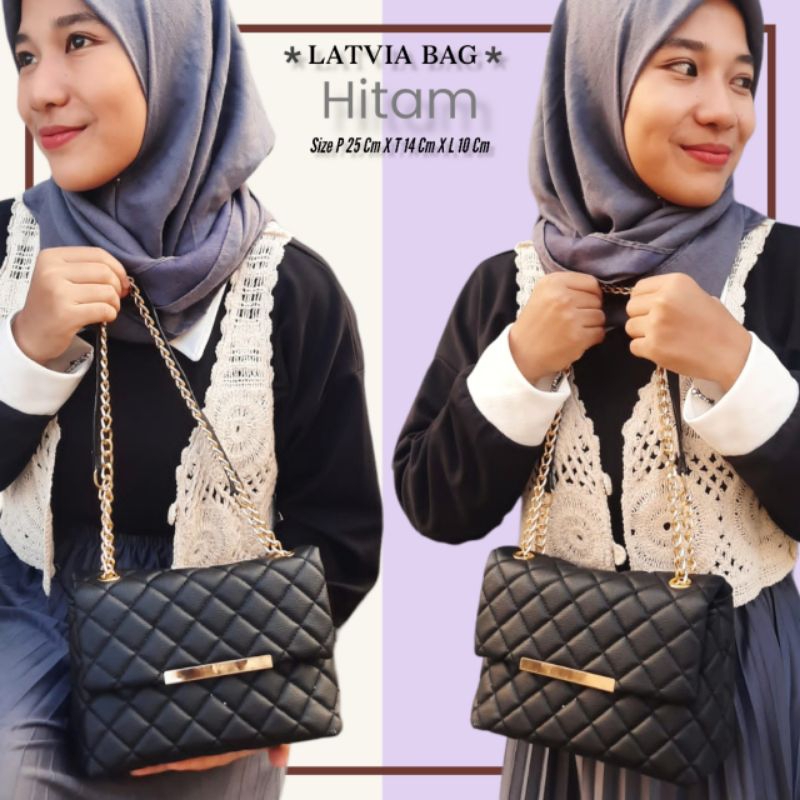 LATVIA Bag - Bahan sintetis semi kulit tebal - SIZE P 25 cm X T 14 cm X L 10 cm - Ada 3 Ruang di bagian dalam ( 2 ruang tanpa resleting dan 1 ruang tanpa resleting) - Ada lapisan kain furing warna Hitam di bagian dalam tas - Tali Rantai Gold kombinasi tali bahan - Accesories warna Gold - Pengunci bentuk Plat warna Gold menambah kesan cantik dan elegant