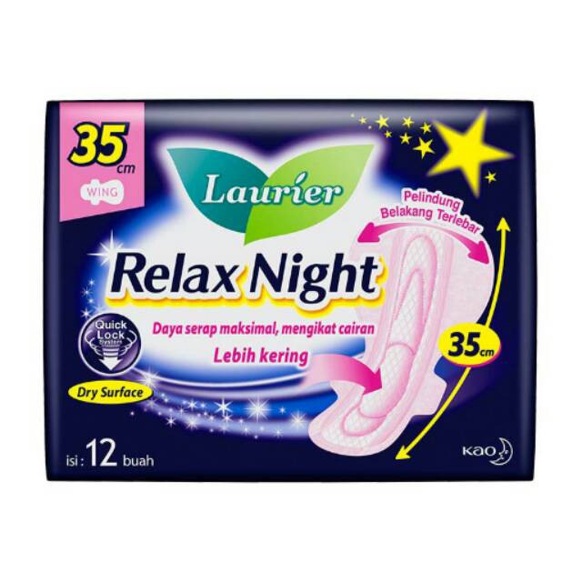 Nikmati laurier Relax Night selama tidurmu,cukup 1 pembalut saja sepanjang malam. lebih kering Quicklock system dengan dry surface mampu menyerap cairan dengan cepat,mengikatnya didalam, tak kembali ke permukaan sehingga menjadi lebih kering. Kulit tetap segar dan kering dalam waktu yang lama. Pelindung belakang terlebar panjang 35 cm. Selain panjang juga memiliki pelindung belakang terlebar dan tiga garis pelindung belakang tak bocor belakang pada gerakan tubuh dan posisi tidur apapun. Dan memberikan kenyamanan ekstra.