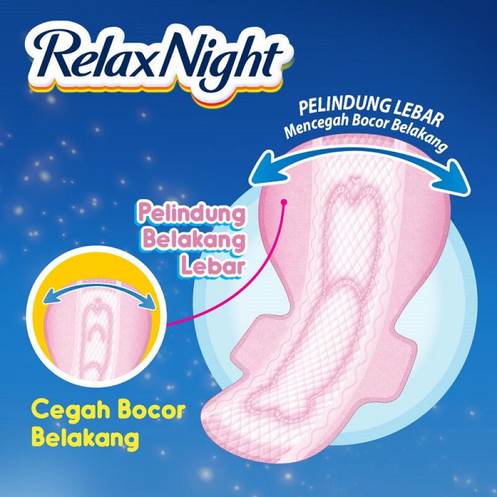 Laurier Relax Night Wing merupakan pembalut untuk malam hari yang dilengkapi QuickLock System dengan Dry Surface yang mampu menyerap cairan dengan cepat, mengikatnya di dalam dan tak kembali ke permukaan sehingga lebih kering. Sehingga kulit tetap segar dan kering dalam waktu yang lama. LAURIER Relax Night Wing dengan panjang 35cm, juga memiliki pelindung belakang terlebar dan tiga garis pelindung. Tak akan bocor belakang pada gerakan tubuh dan posisi tidur apa pun. Lapisan super kering dan lembut, memberikan kenyamanan extra di malam hari.