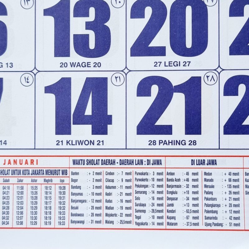 Detail dan Spesifikasi Produk : • Size kertas : 50 x 32 cm • Size reklame : 32 x 12 cm • Kertas : HVS 60 gram • Dilengkapi dengan huruf arab , terdapat pasaran jawa : pahing, pon, kliwon • Terdapat jadwal sholat • Produk dikirim dalam keadaan digulung