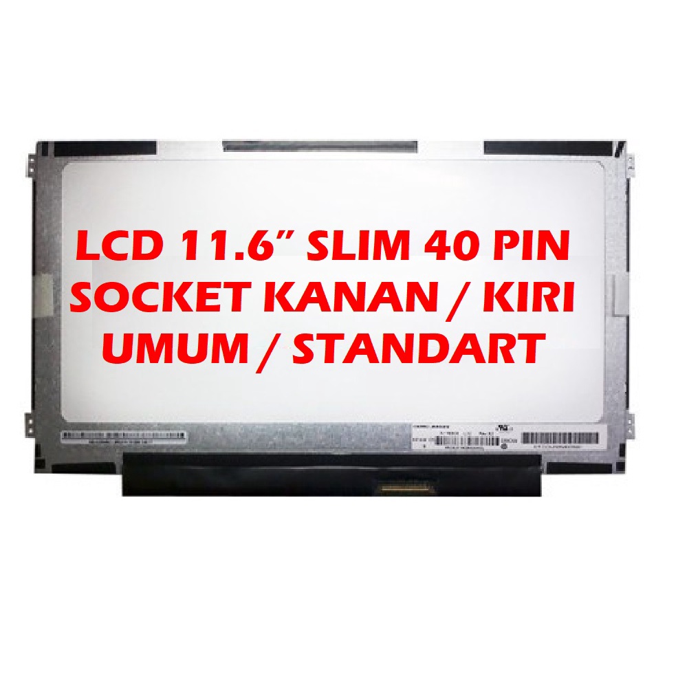 SUPORT MERK / TIPE : 1. LCD 11.6 SLIM 40 PIN LENOVO IDEAPAD S200 S206 S210 S215 S20-30 LCD 11.6" 40 PIN SOCKET KANAN - KIRI 2. LCD 11.6 SLIM 40 PIN ASUS X200 X200C X200CA X200M X200MA S200E X201 X201E LCD 11.6" 40 PIN SOCKET KANAN - KIRI 3. LCD 11.6 SLIM 40 PIN SONY VAIO SVE11135CVB LCD 11.6" 40 PIN SOCKET KANAN - KIRI 4. LCD 11.6 SLIM 40 PIN UMUM N116BGE-L42 N116BGE-L32 B116XW03 LCD 11.6" 40 PIN KANAN - KIRI LED LCD 11.6" SLIM 40 PIN SOCKET KANAN KIRI Full Competible Merk: Asus, Dell, HP, Compaq, Lenovo, Toshiba Dll Suport segala merk connector + pin sama