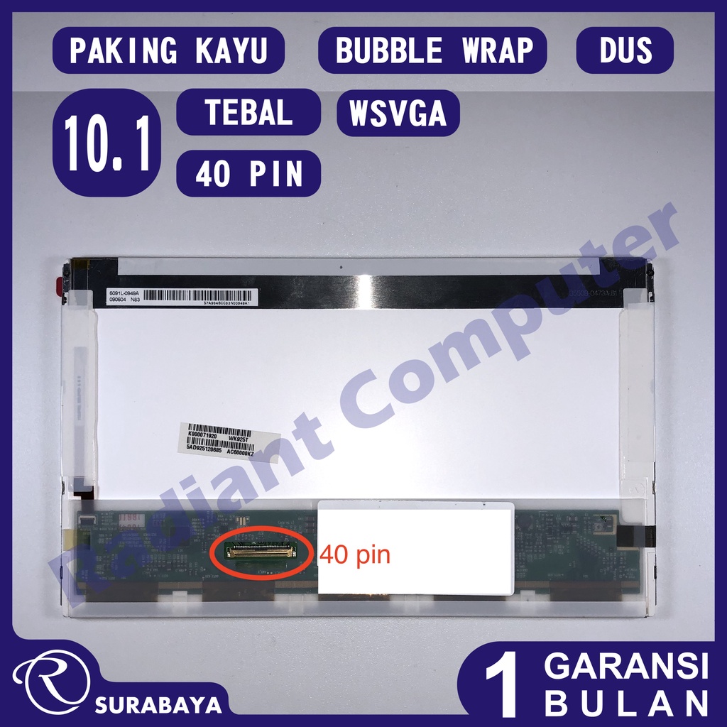 Spesifikasi SKU: LED101WN1 Ukuran: 10.1 inch, standard Resolusi: WSVGA, 1024 x 600 pixels Backlight: LED Konektor: 40 pin Touchscreen: Tidak Bracket: tanpa bracket Kondisi : Baru, sudah ditest berfungsi normal Keterangan: foto hanyalah ilustrasi dan contoh yang menunjukkan spesifikasi utama seperti bentuk fisik secara umum, jumlah pin, posisi bracket, barang yang dikirim bisa berbeda merk dan nomor model tapi pasti kompatibel