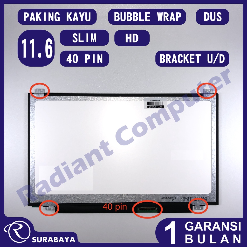 Spesifikasi (for specs in English please scroll to the bottom) SKU : LED116WSA Ukuran 11.6 inch, Slim Resolusi: HD, 1366 × 768 pixels Backlight: LED Konektor: 40 pin Bracket: Atas-Bawah Kondisi: Baru Keterangan: foto hanyalah ilustrasi dan contoh yang menunjukkan spesifikasi utama seperti bentuk fisik secara umum, jumlah pin, posisi bracket, barang yang dikirim bisa berbeda merk dan model tapi pasti kompatibel