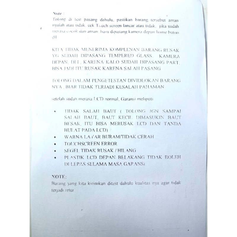GARANSI TERMASUK : WARNA LAYAR BURAM/TIDAK CERAH TOUCHSCREEN ERROR LCD BLANK/ERROR SEGEL TIDAK RUSAK / HILANG PLASTIK LCD DEPAN BELAKANG TIDAK BOLEH DI LEPAS SELAMA MASA GARANSI