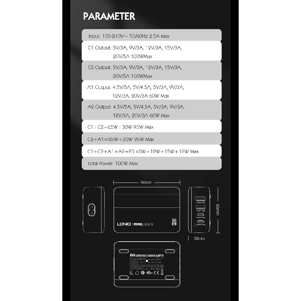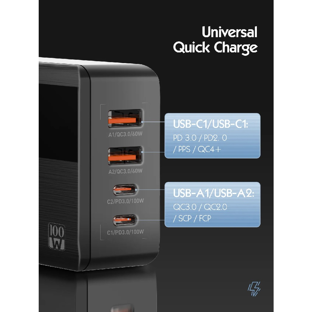 Main Features: - 100W PD Fast Charging & LED Display: has a high-speed output of 100W and has an LED display that shows amperage and voltage in real-time - One for All: has two USB-C ports (up to 100W) supporting PD (Power Delivery) 3.0 and QC4+/PPS/AFC/FCP protocols, and two USB-A ports (up to 60W) supporting QC (Quick Charging) 3.0 and FCP/SCP/AFC protocols. Compatible with most devices that can be charged via USB-C and USB-A - New GaN Technology: lightweight and travel-friendly design