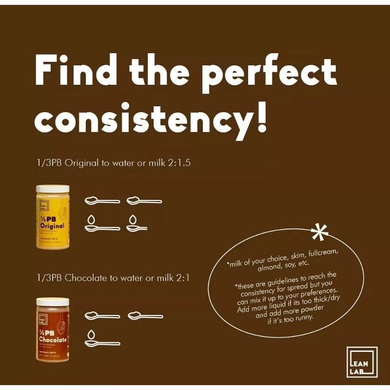 Lean Lab 1/3 PB adalah selai bubuk pertama di Indonesia. Dibuat menggunakan bahan-bahan pilihan, 1/3PB telah dipisahkan kandungan minyaknya dan menjadi selai rendah kalori yang ideal untuk gaya hidup sehat anda.