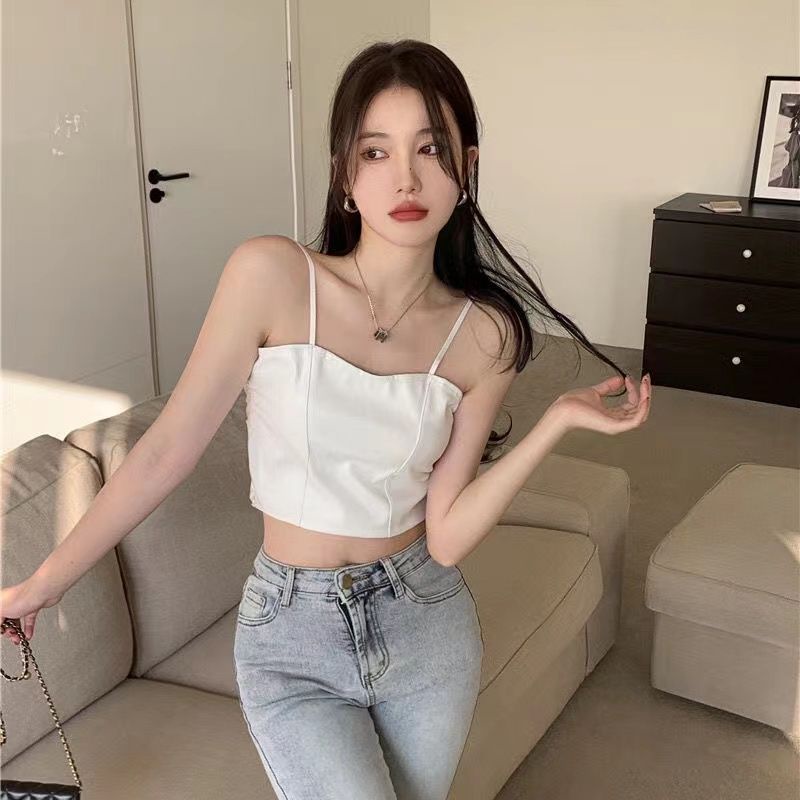 Detail leather Tank Top suspender crop Tanpa lengan// bralette Korea tanktop kulit polos tali bahu spaghetti