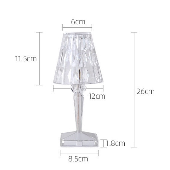Fitur: - Bentuk kristal akrilik yang indah. Lampu meja ini menggunakan kristal tembus pandang 360 derajat, praktis dan dekoratif. - Terbuat dari bahan akrilik dasar plastik, cerah dan nyaman sehingga tidak menyebabkan sakit pada mata. - Memiliki design yang cantik menambah keindahan estetika pada hiasan rumah. - Daya listrik rendah namun menghasilkan cahaya yg terang dan hemat energi lingkungan