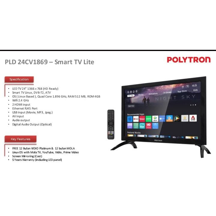 Detail LED Smart TV Lite Polytron 24CV1869 24 Inch Garansi Resmi