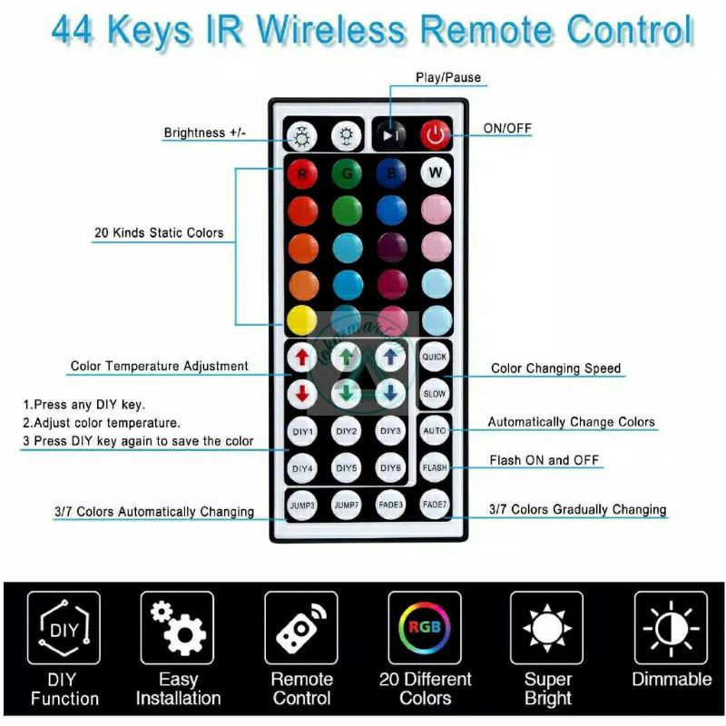 LED 5050 : TIPE LED LEBIH BESAR, 1 LED BISA BERGANTI WARNA, PILIHAN WARNA LEBIH BANYAK.. ADA SEKITAR 20 WARNA, ADA PUTIH, UNGU, MERAH, BIRU, DLL.. BISA DI ATUR DENGAN MENGGUNAKAN REMOTE