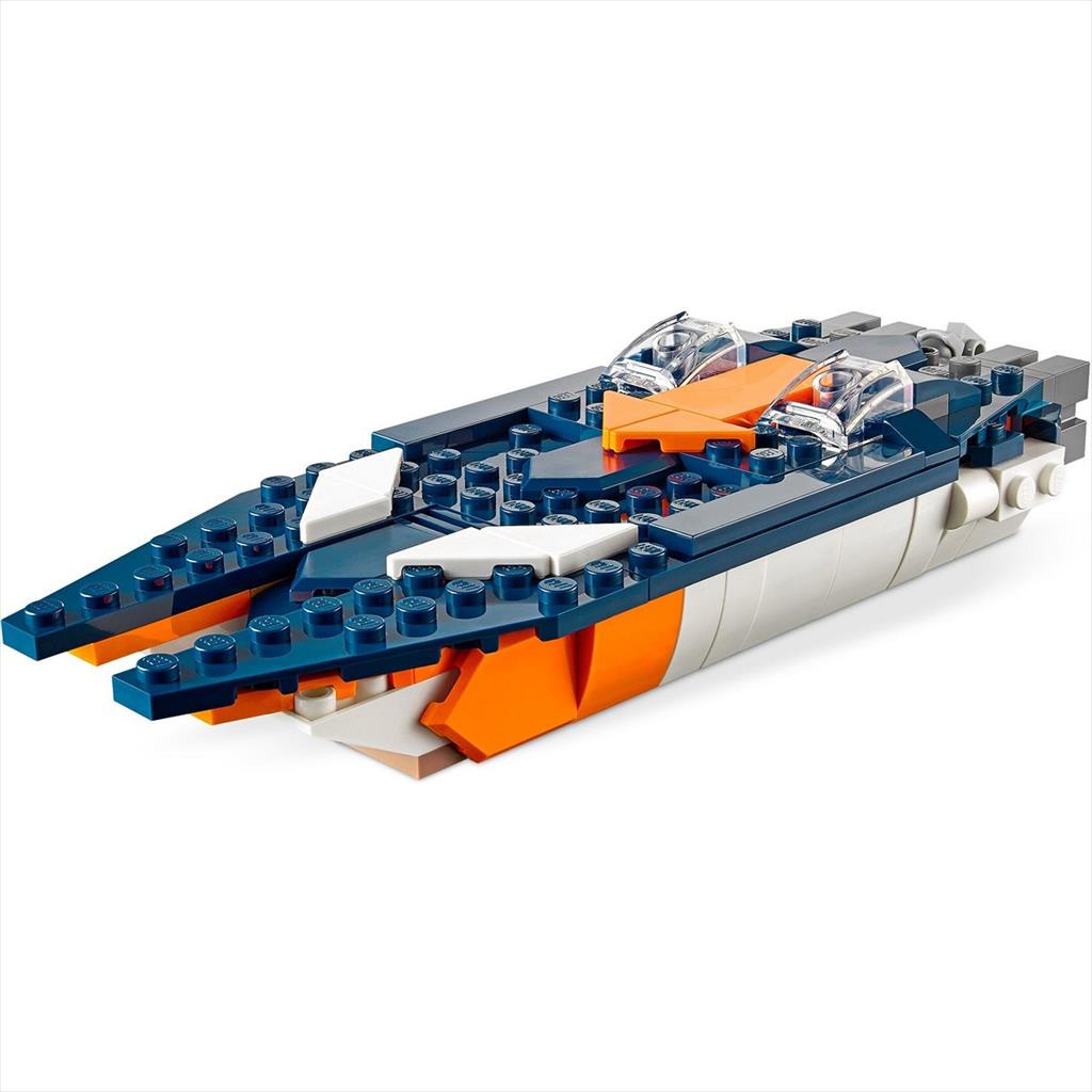 - 3in1 toy. Kids can indulge in creative fun with the LEGO Creator 3in1 Supersonic-jet (31126) building set, featuring 3 models in 1: a jet plane, a helicopter and a powerboat - LEGO fans can perform stunts in the air with the jet plane and the helicopter and race on the water with the powerboat - The Supersonic-jet has a cockpit, angled wings and retractable wheels, while the helicopter has rotating blades and the powerboat features 2 superfast engines - Kids aged 7 and up can enjoy a quick and easy build with this 215-piece set before playing out stories with the 3 different vehicles - The Supersonic-jet measures over 3 in. (8 cm) high, 10.5 in. (27 cm) long and 6 in. (16 cm) wide