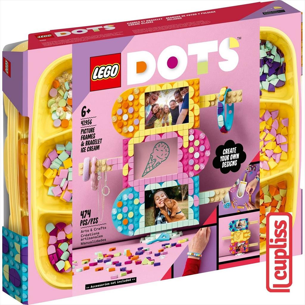 - Surprise little crafters with these LEGO DOTS Ice Cream Photo Frames & bracelet (41956) craft set. The creative fun starts as soon as they open the package - Kids can boost their design skills with this set, which includes 3 ice cream-shaped photo frames, a narrow blue bracelet and tiles to decorate everything - This set is made for imaginative activities. Kids can also combine it with one of the LEGO DOTS Extra DOTS bags or sets (sold separately) for even more fun designs - Little crafters will love this customizable set. The sturdy picture frames, narrow bracelet and colorful tiles make a great gift for creative children - The picture frames are about 20 cm high and 24 cm wide, so children have plenty of room to be creative and create their own style show