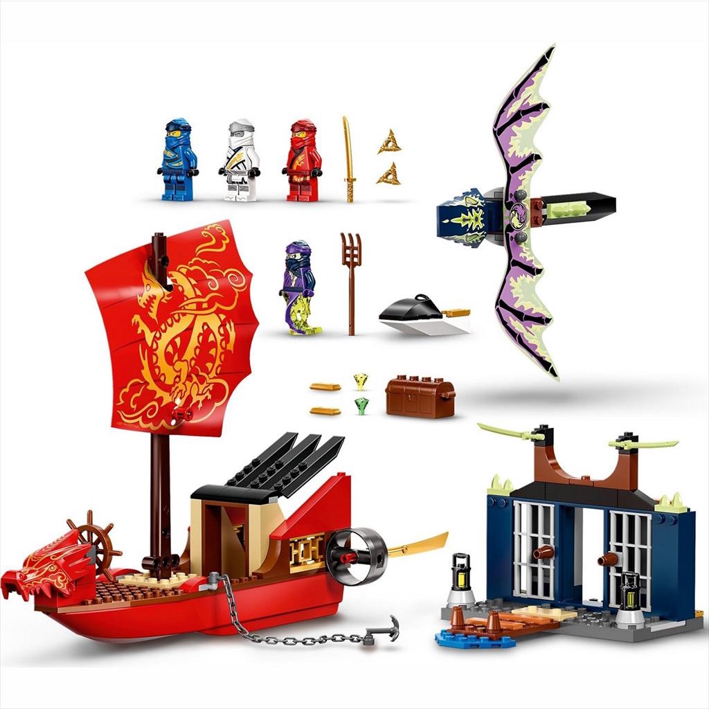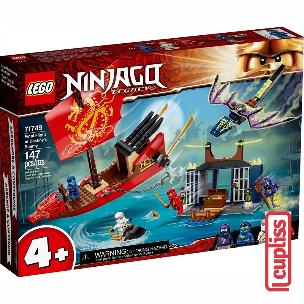 - LEGO NINJAGO Final Flight of Destinys Bounty (71749) introduces youngsters to building before they recreate ninja stories with this LEGO ship playset crammed with exciting features. - Playset includes 4 minifigures ninjas Kai, Zane and Jay and their enemy Ghost Ninja Karenn, plus a Starter Brick to get the fun started quickly. - The Destinys Bounty ship boasts a foil sail, rotating boosters, a steering wheel, a detachable jet ski toy and an anchor on a chain to really fire up youngsters imaginations. - The playset also features a dragon toy with wings that flap when kids apply pressure on its back. There is also a saddle for the ninja minifigures to ride in. - The Destinys Bounty ship measures over 8 in. (21 cm) high, 12.5 in. (32 cm) long and 4.5 in. (12 cm) wide