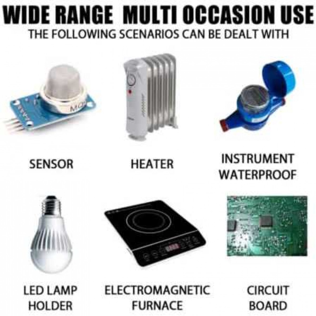 Tahan Segala Efek Ketika lem ini kering, kabel akan terlindungi sempurna dari panas, arus listrik, suhu tinggi, UV, air, dan semacamnya.