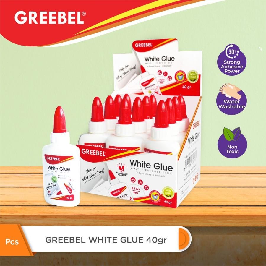 White Glue Greebel ukuran 40 gr • White Glue digunakan untuk kegiatan ketrampilan misalkan menempel stik es krim, kayu, biji-bijian, daun-daunan, dan lain-lain • White Glue Greebel tidak berbau dan telah lulus uji toksisitas ( non toxic formula ) sehingga aman digunakan oleh anak-anak. • White Glue Greebel memerlukan waktu untuk kering lebih lama dari glue stik tapi daya rekat yang dihasilkan sama kuatnya.