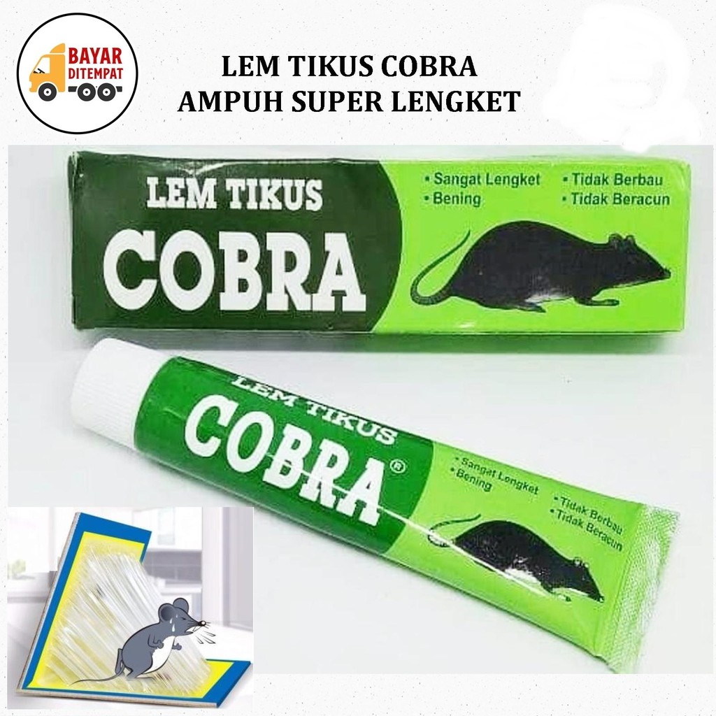 Lem Tikus Cobra Sangat Lengket Bening Tidak Berbau, tidak membuat tikus curiga Tidak Beracun Lem Tikus Cap COBRA Super Lengket, Bening, dan Tidak Bau. 100% sangat lengket. Lem tikus berbentuk pasta ini ampuh menjebak tikus di rumah, toko, kantor, pabrik dan tempat lainnya. Lem ini bisa menjebak berbagai ukuran tikus. Cara Penggunaan Lem Tikus Cap COBRA : 1. Oleskan dengan rata secukupnya lem tikus cap COBRA pada sepotong papan/karton dengan gerakan melingkar. 2. Letakkan umpan yang berbau makanan wangi di tengahnya dan pasang di tempat yang sering dilalui tikus. Karena bening dan tidak berbau, tikus takkan curiga. 3. Lem tikus cap COBRA dapat digunakan berulang kali.