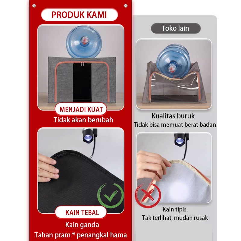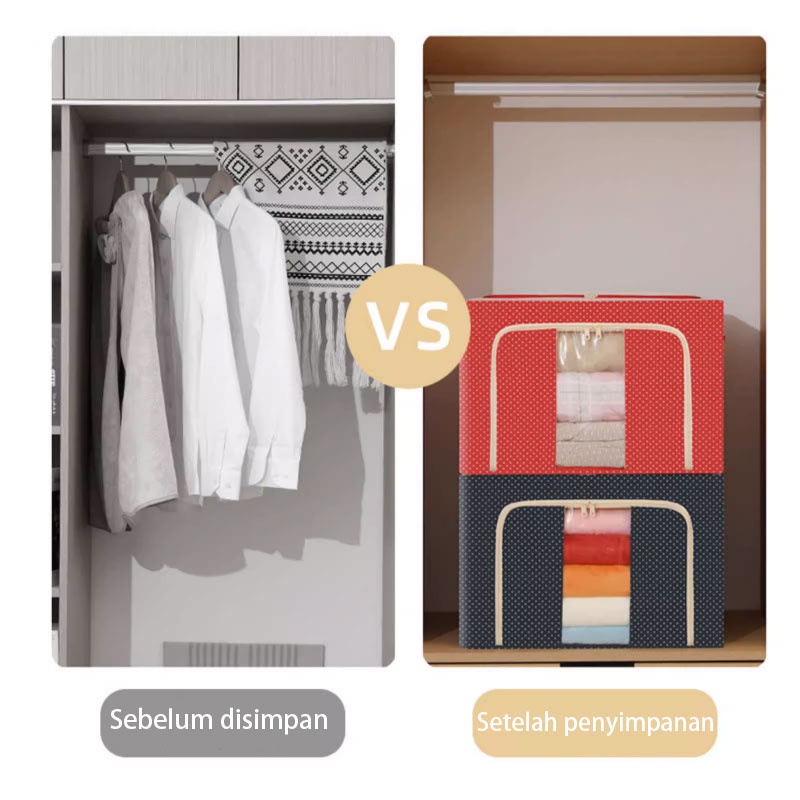 box ini terdapat 2 pintu, bisa buka dari atas dan samping. Pintu atas cocok untuk mengisi pakaian atau mainan ke dalam box. Pintu depan cocok untuk mengambil pakaian keluar dari box. Sangat Praktis - Material : Oxford tebal - Style : Korean Style - Spesifikasi : rangka baja dapat dicuci - Cocok ditempatkan di lemari pakaian - Kotak penyimpanan serbaguna bisa menyimpan pakaian, selimut, mainan anak dll - Kapasitas besar dan kuat - Bahan transparant sehingga mudah terlihat - Dengan seleting ganda kuat dan aman - Dengan gagang mudah untuk di pindahkan