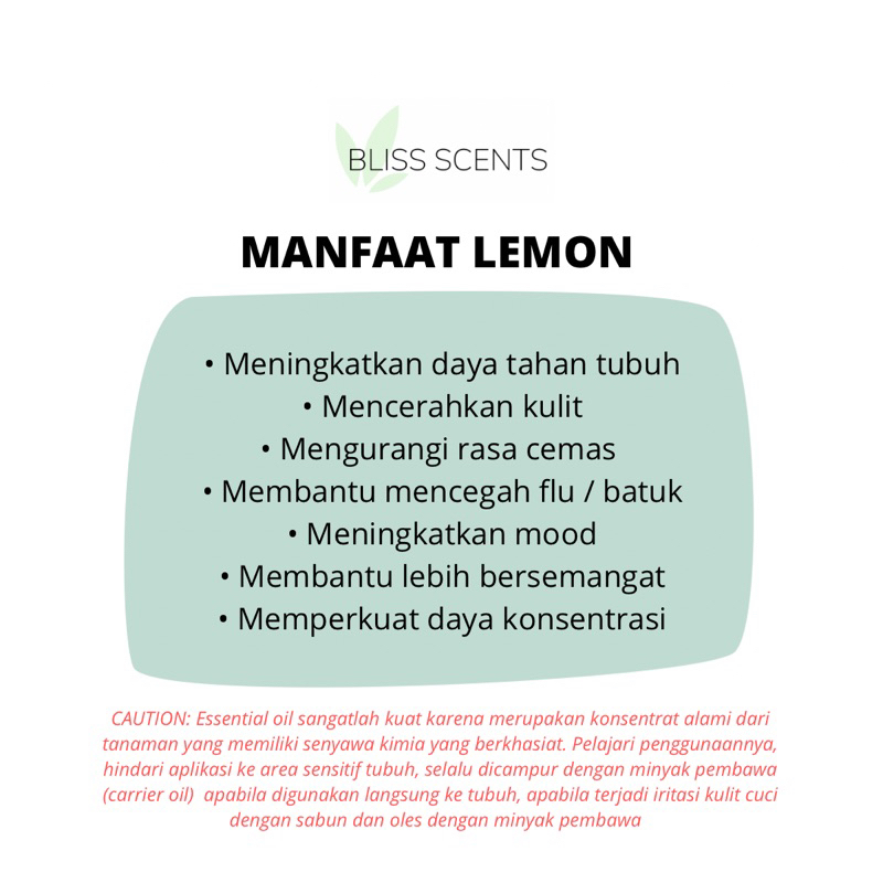 PENTING: Produk Bliss Scents tidak dimaksudkan untuk mengobati atau menjadi pengganti obat. Semua produk hanya untuk penggunaan luar dan tidak dimaksudkan untuk dikonsumsi. Essential oil murni, tanpa penguat aroma atau campuran apapun. Penggunaan essential oil dengan diffuser berfungsi untuk menyebarkan molekul dari essential oil ke udara untuk mendapatkan manfaat terapeutik dari essential oil tsb.