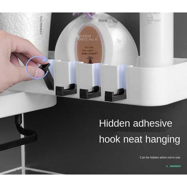 Empat Pengait Dilengkapi dengan empat pengait yang dapat dibuka dan ditutup menyesuaikan kebutuhan. Anda dapat menggantung apa saja, mulai dari spatula, penjepit, dan busa kamar mandi, menyesuaikan penempatan rak.