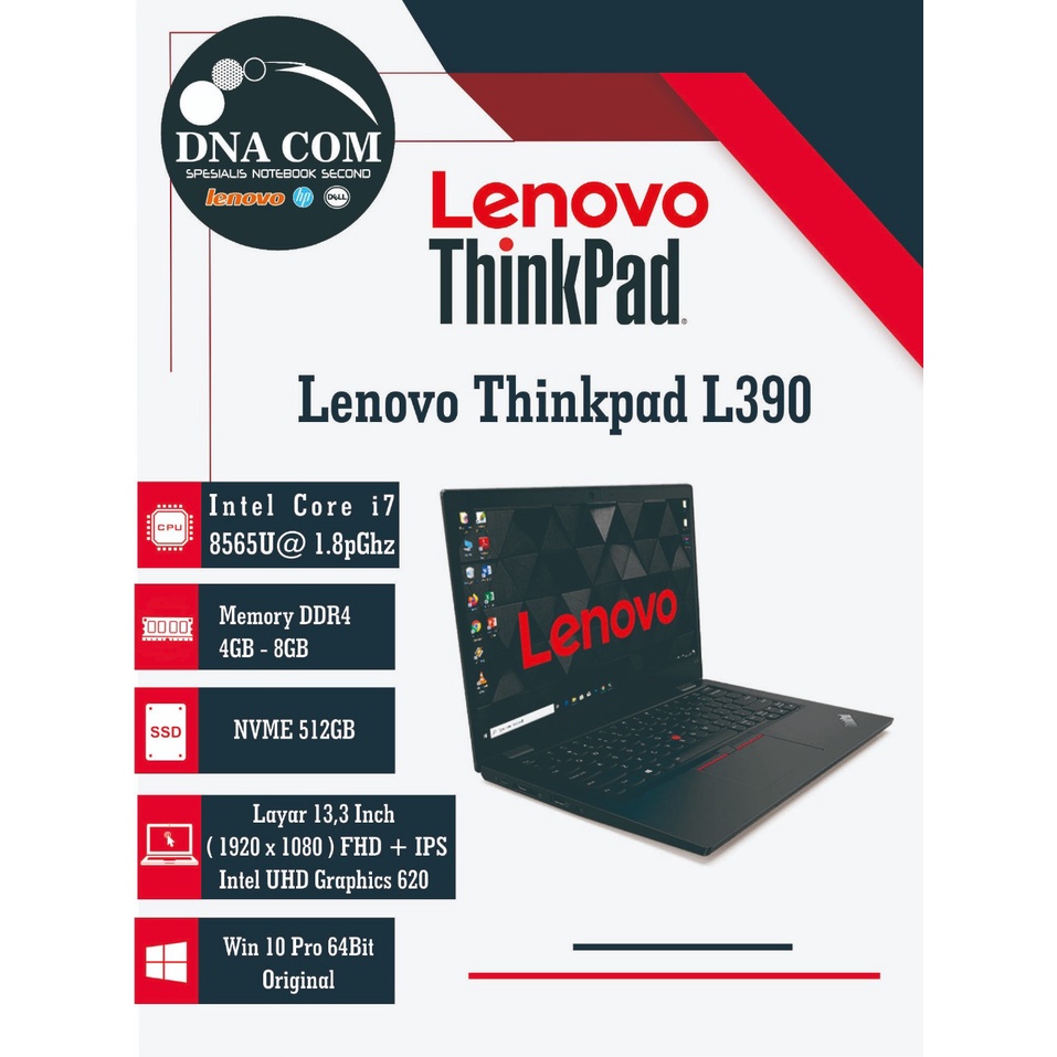 Lenovo Thinkpad L390 i7-8565U Didesign Slim Dan Elegan Dengan Perpaduan Keyboard US Serta Windows Original,Silahkan Diorder Bosque Sebelum Kehabisan ============================ -Intel Core i7-8565U@ 1.8pGhz -Memory DDR4 8GB - 16GB -SSD NVME 512GB ( Fast Booting ) -Layar 13,3 Inch ( 1920 x 1080 ) FHD + IPS -Intel UHD Graphics 620 -Wifi -Camera -Port Usb -Port Hdmi -Port Type C -Port SD Card ========================= -OS: WIN 10 Pro 64 bit ( Original ) -S/W: Mozilla, Office, Winamp, Klite, PDF, VLC ( Standart Pemakaian Kantor, Rumahan ) ================================ -BATERAI: Minimal 2 Jam Tergantung Pemakaian -KONDISI: Baret Pemakaian Wajar ( Harap Maklum Ini Barang Second,Ekspektasi Jangan Seperti Baru ) -Hardware Good Tes =============================== -KELENGKAPAN: Unit + Adaptor + Tas -Buat Daerah Jakarta Dan Sekitarnya Kalo Ada Gosend Pilih Gosend Aja Biar Cepat -Buat Yang Berada Di Luar Daerah, Packingan Akan Menggunakan Bubble Wrap Tebal Dijamin Aman Sampai Tujuan ============================== GARANSI PERSONAL : -1 BULAN Setelah Terima Barang,Dengan Syarat Dibawah Ini *Saat Konfirmasi Terima Barang Memberikan Bintang Dan Ulasan Positif -Bagi Yang Claim Garansi Silahkan Chat Kita -Garansi Dianggap VOID / Tidak Berlaku Jika Memberikan Ulasan Negatif =============================== Terimakasih Sudah Order Ditoko Kami Happy Shopping