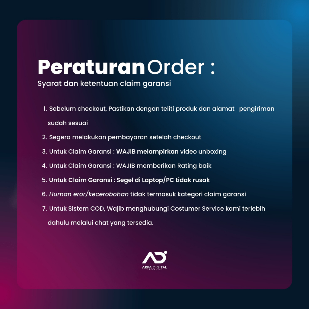 Ketentuan Garansi -Harap sertakan Vidio Unboxing saat membuka paket -Tidak human eror (Kesalahan diri sendiri) -Tidak Terjatuh,Terbakar dan Terkena air -Penilaian harus di atas bintang 4 dan ulasan harus positive. Apa bila sarat di atas tidak terpenuhi maka garansi di anggap hangus.