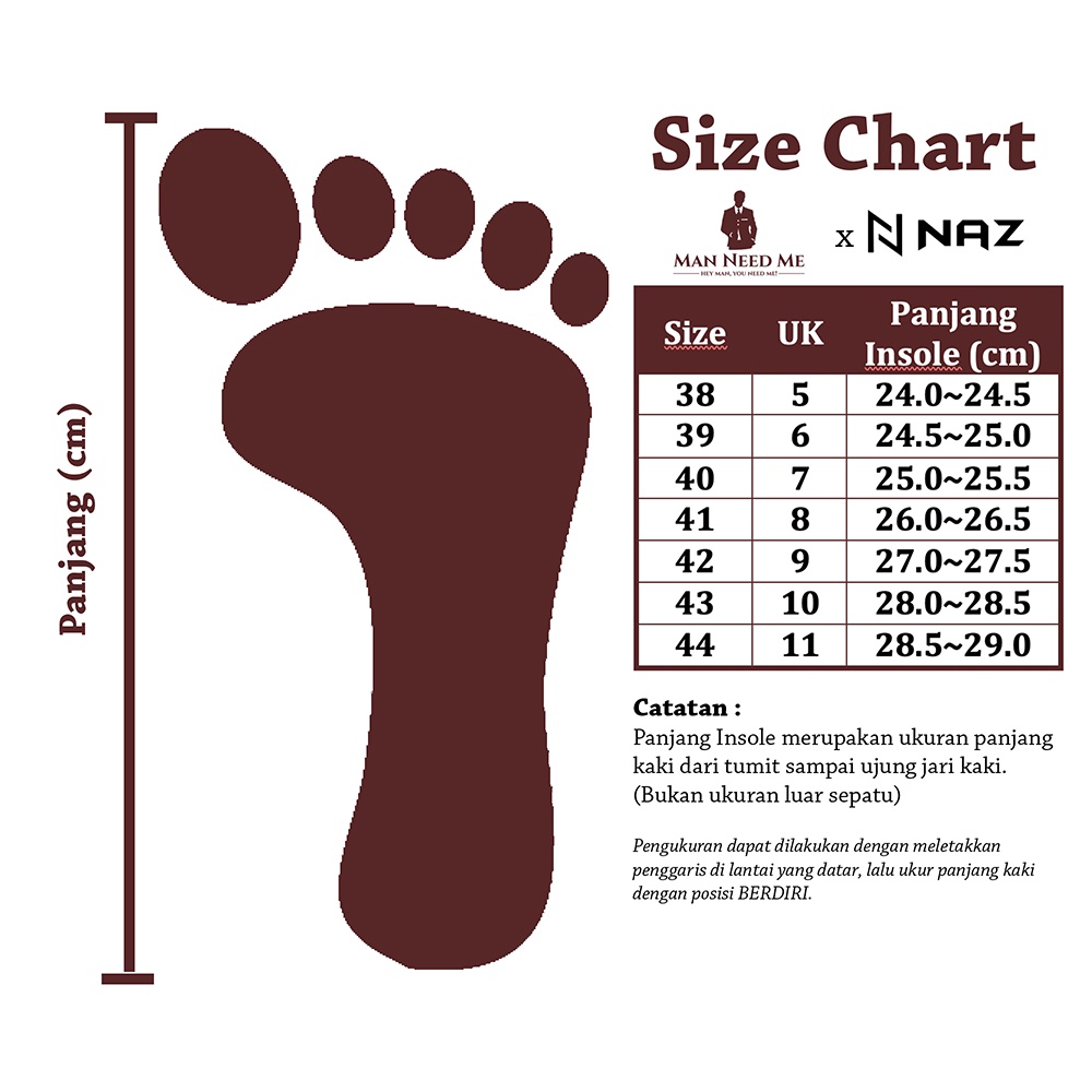 Size Chart (Insole/Panjang kaki) : Size 39 : 24.5 ~ 25.0 cm Size 40 : 25.0 ~ 25.5 cm Size 41 : 26.0 ~ 26.5 cm Size 42 : 27.0 ~ 27.5 cm Size 43 : 28.0 ~ 28.5 cm (Untuk cara Pengukuran, silakan lihat di panduan ukuran)