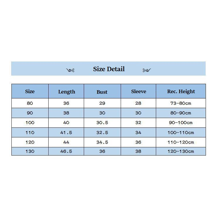 Tersedia 6 Size Size 80 - Panjang : 36cm, Lingkar Dada : 29cm, Lengan : 28cm, Rekomendasi Tinggi : 73-80cm Size 90 - Panjang : 38cm, Lingkar Dada : 30cm, Lengan : 30cm, Rekomendasi Tinggi : 80-90cm Size 100 - Panjang : 40cm, Lingkar Dada : 30.5cm, Lengan : 32cm, Rekomendasi Tinggi : 90-100cm Size 110 - Panjang : 41.5cm, Lingkar Dada : 32.5cm, Lengan : 34cm, Rekomendasi Tinggi : 100-110cm Size 120 - Panjang : 44cm, Lingkar Dada : 34.5cm, Lengan : 36cm, Rekomendasi Tinggi : 110-120cm Size 130 - Panjang : 46.5cm, Lingkar Dada : 36cm, Lengan : 38cm, Rekomendasi Tinggi : 120-130cm