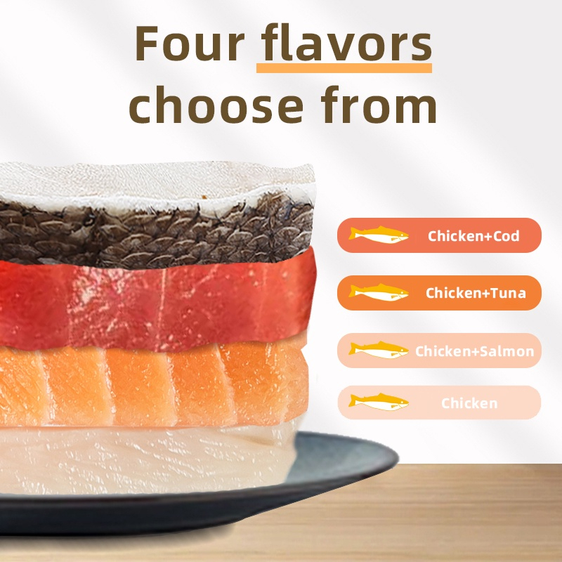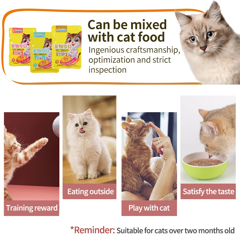---Nama komoditas: Cemilan kucing ---Gunakan objek: Kucing ---Konten/Spesifikasi Bersih: 80G/TAS ---Komposisi Bahan Baku: Ayam/Tuna/Beef, MINERAL DAN ELEMEN JEJAK, AIR ---Bahan nutrisi: Taurin, mineral, vitamin, DHA ---Pilihan rasa: Ayam+Kepiting, Ayam+Wortel,Tuna+Teri,Tuna ---Fungsi: 1. Daging yang tidak bisa di tolak 2. Kucing pun menyukainya 3. Dengan kaya akan bahan daging 4. Tinggi protein rendah kalori 5. Kaya akan nutrisi 6. Nutrisi suplemen daging yang lezat
