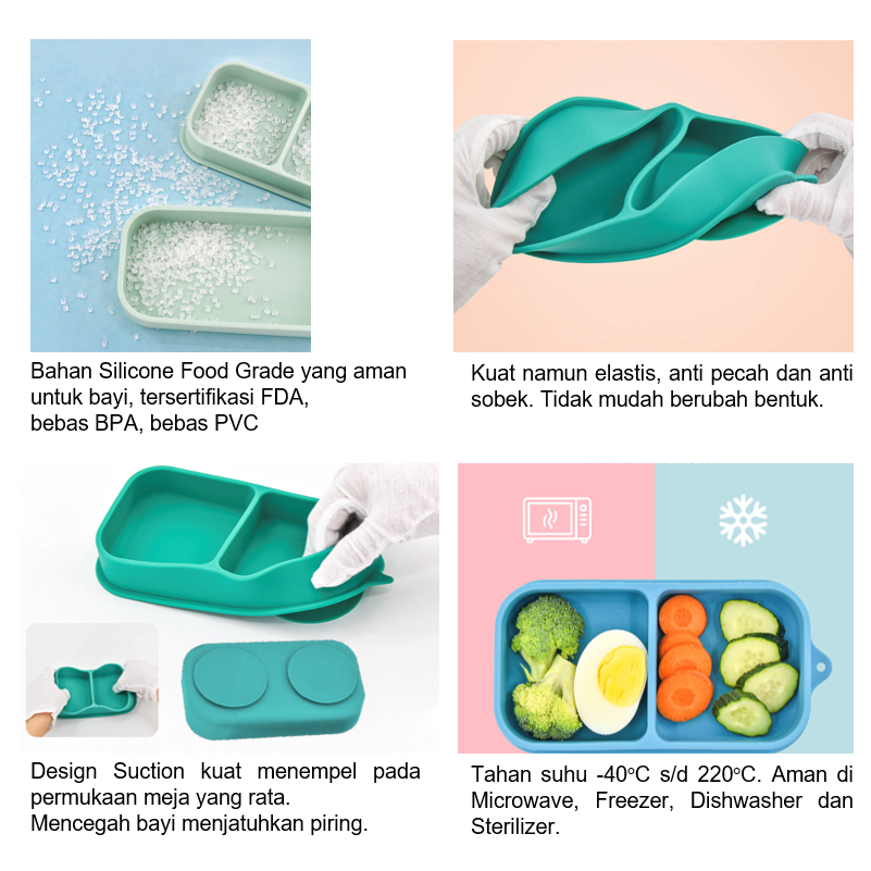KEUNGGULAN: ✅ Bahan Food Grade Silicone yang aman untuk bayi, teruji FDA, bebas BPA, PVC, dan bahan berbahaya lainnya ✅ Design yang compact, 2in1, praktis dibawa bepergian ✅ Terdapat suction yang kuat di bawah kedua piring sehingga anak/bayi tidak dapat menjatuhkan piring ketika makan ✅ Anti Pecah, Kokoh namun Lentur, Awet, Ringan, Waterproof, mudah dibersihkan ✅ Temperature range: -40C s/d 220C. Tahan dingin dan panas. Aman di Microwave, Sterilizer, Dishwasher and Freezer.