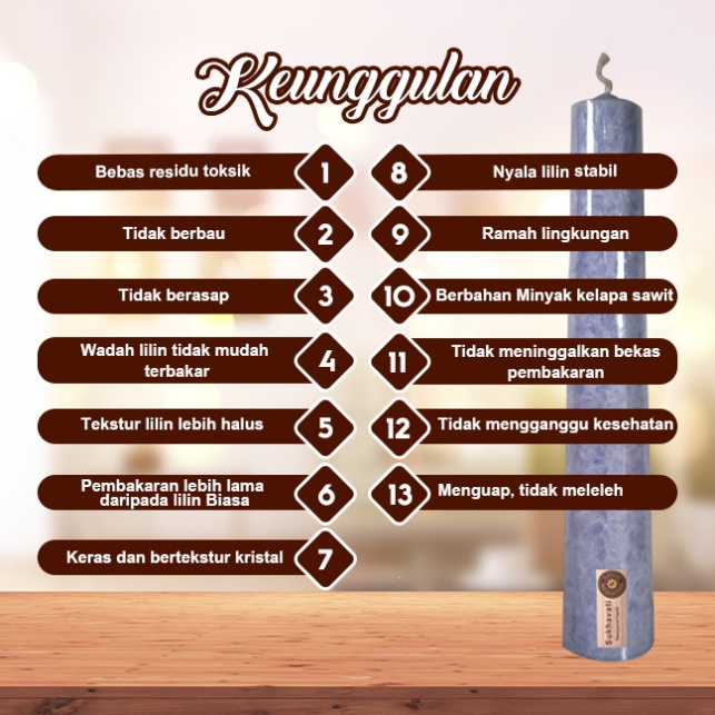 Lilin Sukhavati Marble Premium : - Nyala lilin lebih lama dari lilin Biasa (3x lebih lama) - Lilin terbakar habis & bersih - Ramah lingkungan & aman bagi Kesehatan - Lilin bersifat menguap / Tidak Meleleh - Ukuran 5.5x30 cm
