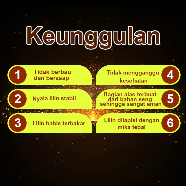 Lilin sembahyang (puja) Double dragon terbuat dari bahan parafin berkualitas, dilengkapi dengan alas alumunium dan mika pengaman sehingga nyala lilin stabil dan tidak mudah padam. Lilin juga habis terbakar dan bersih. Sangat cocok untuk kegiatan ritual harian dan dapat juga di gunakan sebagai penerangan.