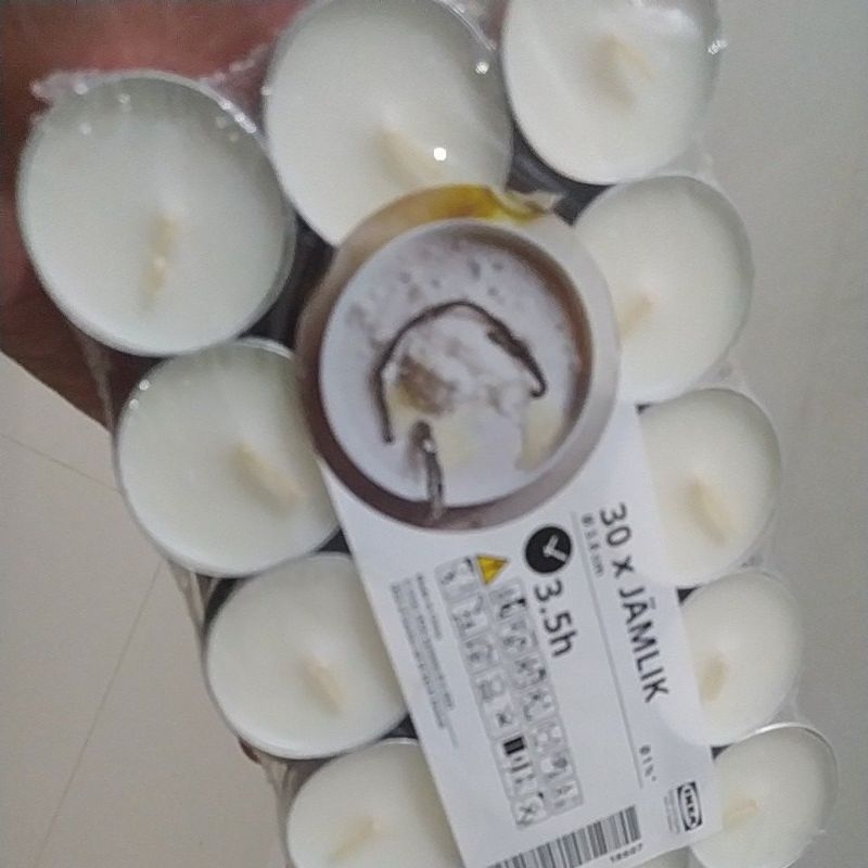 Lilin Jamlik by IKEA, memiliki aroma vanila/ krem muda. Mampu bertahan hingga 3-4 jam menyala ( hanya lilin saja)