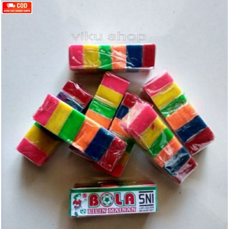 Satu pcs terdiri dari 6 blok kecil 6 warna - Dimensi blok kecil 2,5 x 2 x 1,5 cm - Sudah SNI - Mudah dimainkan, tidak lengket, aroma tidak pekat, warna cerah, tidak beracun - Dapat meningkatkan kreativitas dan motorik anak - Dll