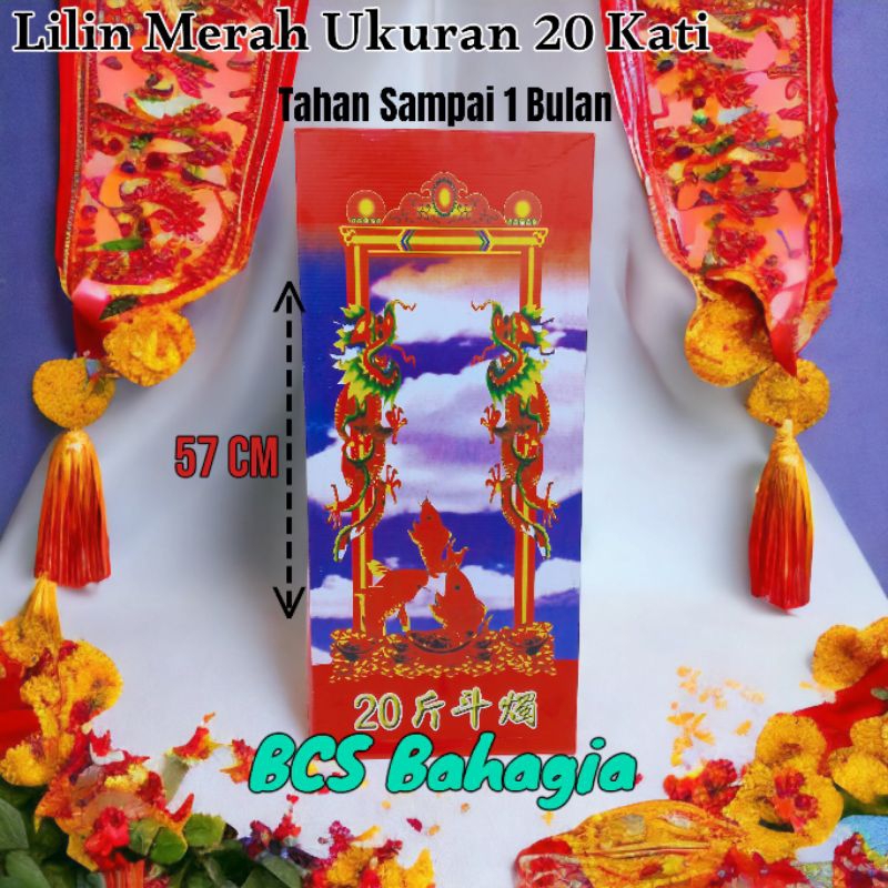 Ukuran 20 Kati Status : Ready Tinggi : +- 52 cm diameter : +- 11,5 cm Isi : 2 batang (satu kotak) Warna : Merah durasi pemakaian : 4 MINGGU UP TO 1 BULAN ! Tatakan : Aluminium kegunaan : 1. bisa untuk sembahyang 2. dan lain lain Kelebihan : - kualitas lilin sangat baik - lilin halus dan padat - waktu menyala panjang - dapat disimpan sampai waktu yang lama