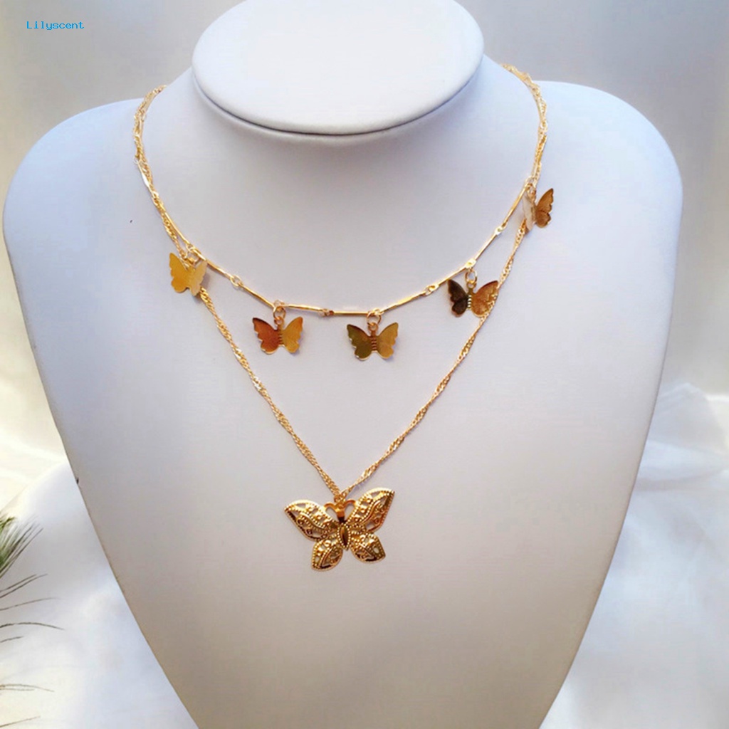 Detail Lilyscent Wanita 2-Layer Butterfly Pendant Choker Rantai Klavikula Kalung Perhiasan Hadiah