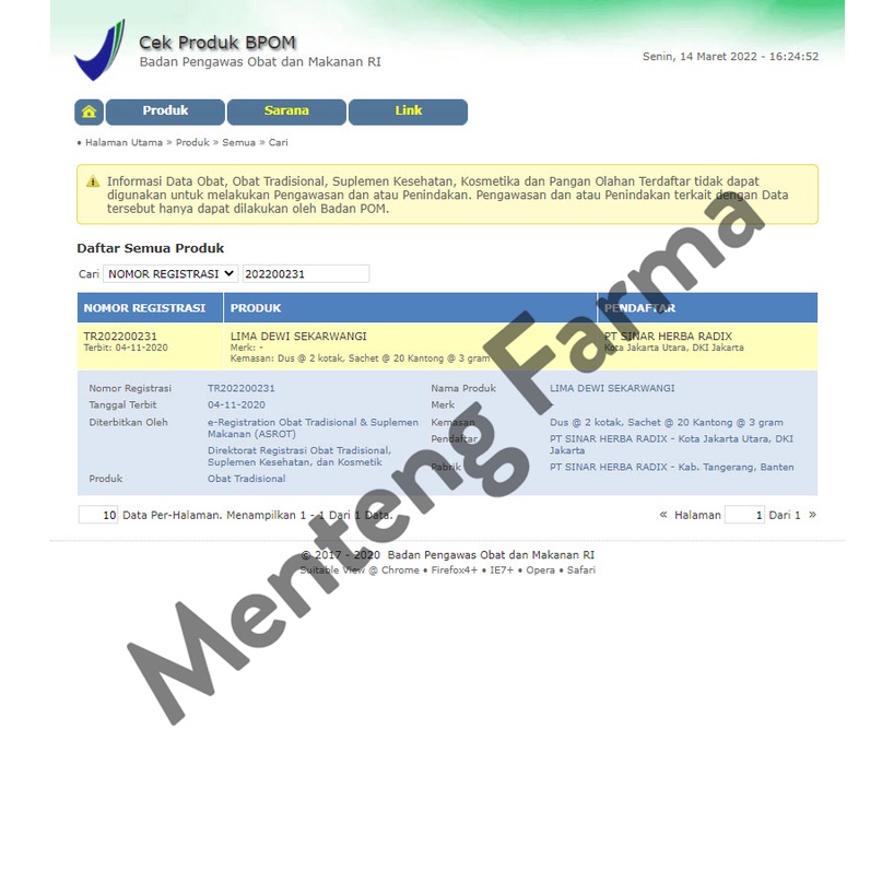 Kemasan: Dus berisi 2 dus kecil @ 20 kantong @ 3 g