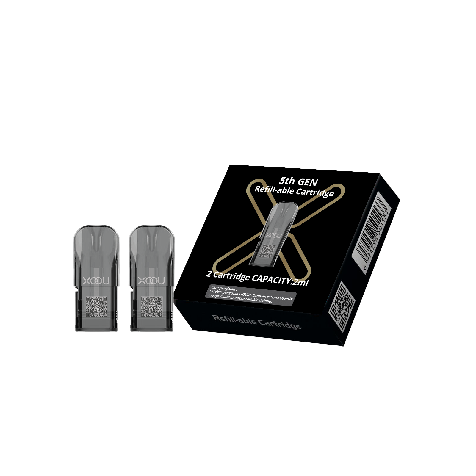 Merk Produk ; XOOU Jenis Produk ; 5th Gen Refill-lable Catridge Capacity : 2 mL per Cartridge Sistem ; Mesh Coil Resistensi ; 0.8 Pemakaian : 5x Refill per Cartridge