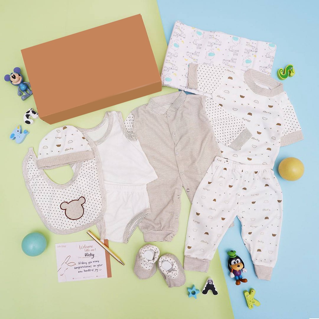 Our economic package with a full set of baby clothing, a perfect all-in set for a gift! Boxed with a bunny printed cardboard box.