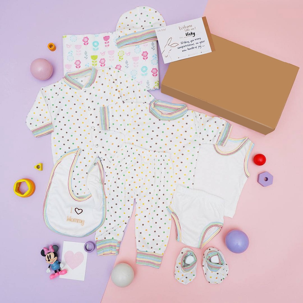Our economic package with a full set of baby clothing, a perfect all-in set for a gift! Boxed with a bunny printed cardboard box.