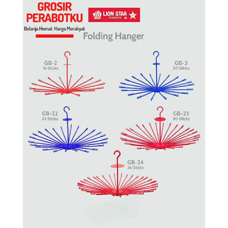 📐 Ukuran : • Lion Star GB-24 Folding Hanger 36 Sticks (839x459mm) • Lion Star GB-23 Folding Hanger 30 Sticks (824x430mm) • Lion Star GB-22 Folding Hanger 24 Sticks (810x430mm) • Lion Star GB-3 Folding Hanger 20 Sticks (785x430mm) • Lion Star GB-2 Folding Hanger 16 Sticks (785x430mm)